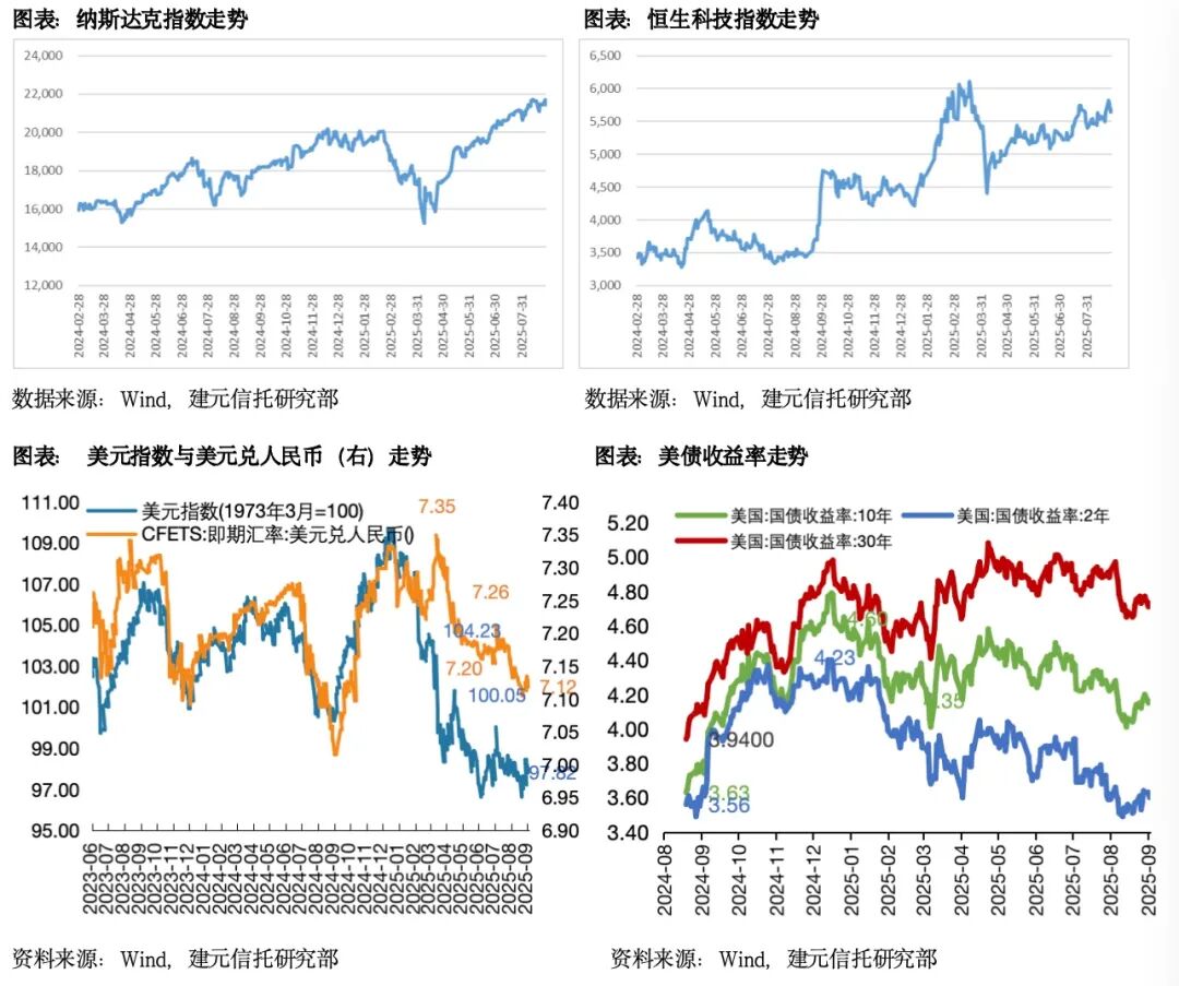 境外市场。境外市场,美股延续上涨但涨势放缓,以英伟达为代表的科技巨头震荡横盘,纳斯达克指数续创历史新高但涨速放缓。港股涨跌趋势与A股相近,但涨幅相对较小,恒生指数表现仍强于恒生科技指数。9月公布的非农数据进一步走低,美联储正式降息25bp,也意味着美国降息节奏再度打开,美元指数整体呈下行走势,但受制于流动性收紧,下行幅度有限。同时,美联储降息也推动美债收益率的大幅下行,但在首次降息落地后联储官员对后续政策态度谨慎,市场情绪有所降温,美债收益率也出现一定幅度的反弹。而黄金在美国降息、美元指数下跌与国际局势不确定性渐增之下呈上行突破走势,COMEX金价再创新高。