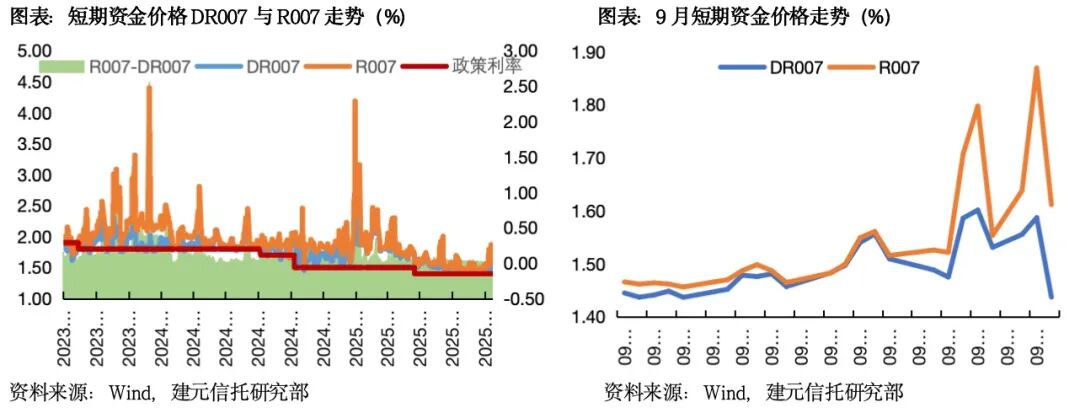 货币市场。9月短期资金价格维持均衡宽松,中期资金价格延续横盘。9月央行整体延续流动性净投放,但呵护力度较为克制,市场一度预期的重启国债买卖也并未兑现,而银行融出水平与上月基本持平,也未现反弹。同时,政府债发行节奏稳定,实体融资需求整体平稳,资金价格维持均衡偏松态势,在税期与跨季出现过季节性收紧,但收紧幅度较温和。中期资金价格延续横盘,SHIBOR 3M几无波动,流动性呈现出稳态。
