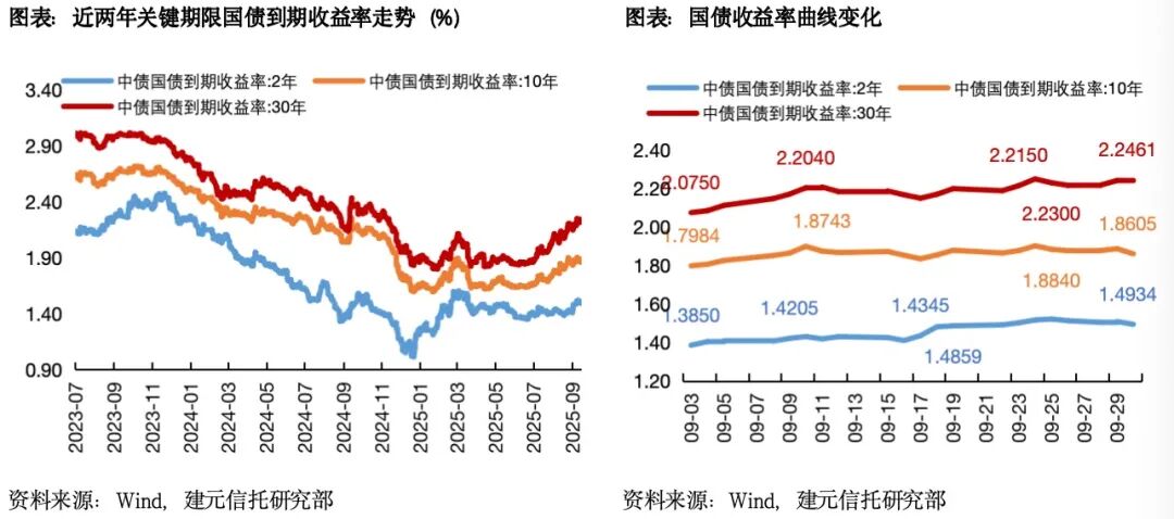 债券市场。9月,利率债收益率震荡上行。基本面数据的走弱仍不被市场所定价,而宏观政策预期依然支撑风险偏好,权益调整始终不深。同时,尽管央行重启国债买卖的预期使债市出现几次波段交易的机会,但基金费率改革政策与免税取消的传闻扰动债市,致配置与交易型机构对债市均维持谨慎,债市情绪脆弱之下收益率呈现震荡上行走势。9月信用债调整主因在于跨季资金扰动与公募赎回压力叠加,3年以内信用债收益率上行10bp左右,5年信用债上行15bp左右,7年和10年信用债分别上行14bp和20bp以上,从目前情况看信用债已经调整出一定性价比。