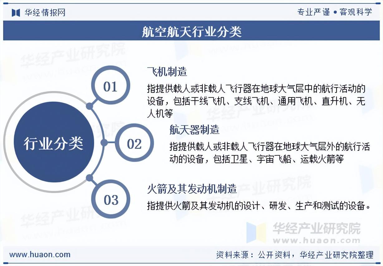 航空航天主要包括飞机制造、航天器制造、火箭及其发动机制造等。其中,飞机制造指提供载人或非载人飞行器在地球大气层中的航行活动的设备,包括干线飞机、支线飞机、通用飞机、直升机、无人机等;航天器制造指提供载人或非载人飞行器在地球大气层外的航行活动的设备,包括卫星、宇宙飞船、运载火箭等;火箭及其发动机制造指提供火箭及其发动机的设计、研发、生产和测试的设备。
