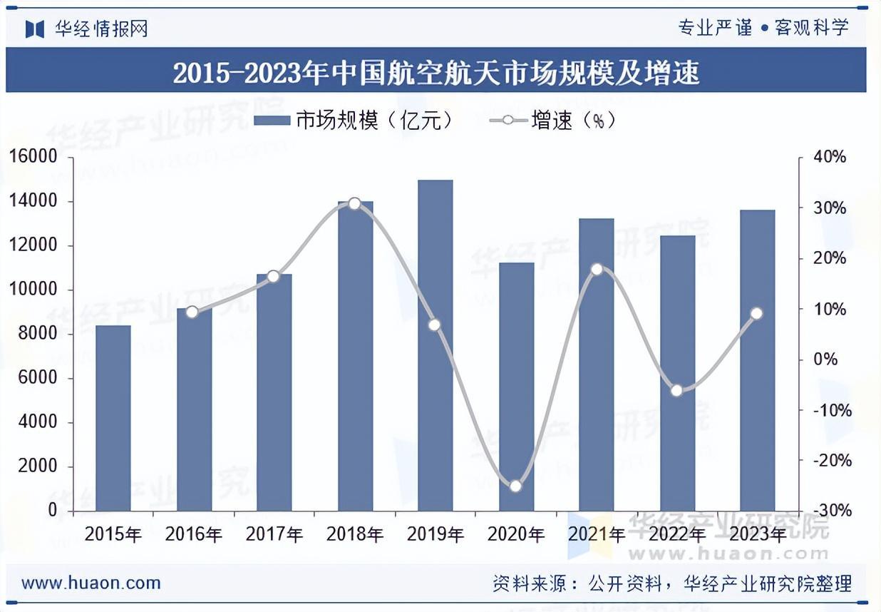 航空航天行业是维护国家安全和推动经济社会发展的战略性产业,具有高技术含量、高附加值、高投入产出比等特点。近年来,我国在政策支持和市场需求的双重驱动下,航空航天市场规模总体呈现出波动增长态势,2022年中国航空航天市场规模约为12476.9亿元,同比减少5.95%。2023年中国航空航天市场规模超过1.3万亿元。