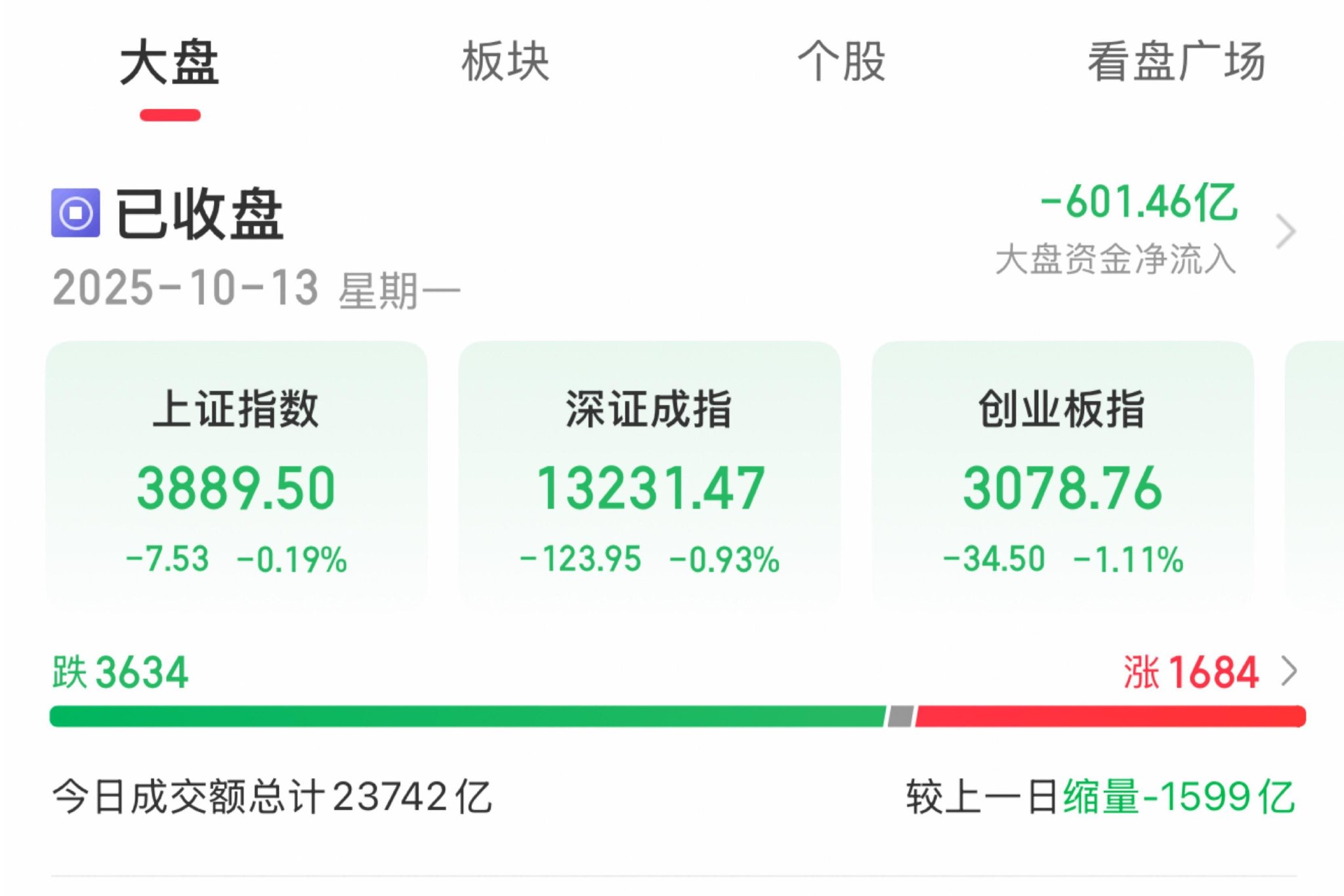 A股三大指数今日集体下跌,截至收盘,上证指数跌0.19%,深证成指跌0.93%,创业板指跌1.11%,北证50跌1.29%。沪深京三市全天成交额23742亿元,较上日缩量1599亿元。全市场超3600只个股下跌。