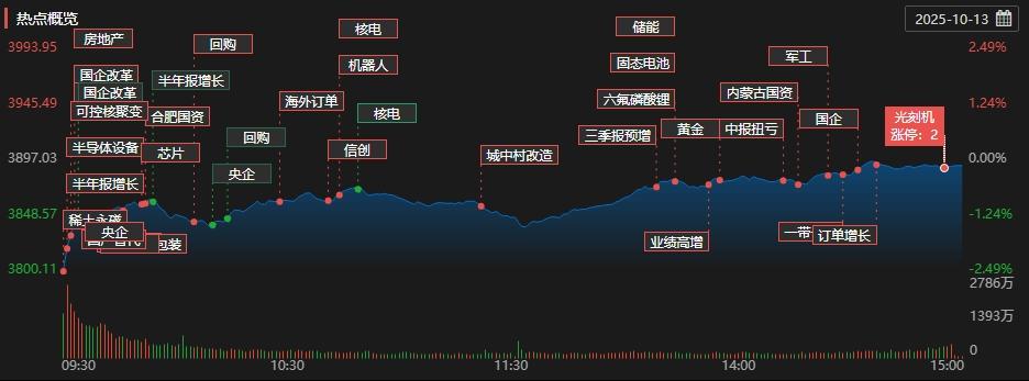 盘面上,稀土永磁板块大涨掀起涨停潮,中国稀土(000831)、北方稀土(600111)、银河磁体(300127)等10余股盘中涨停。有色金属、黄金股午后大幅拉升,西部黄金(601069)、招金黄金(000506)、白银有色(601212)等多股封板。半导体同样表现强势,华虹公司20cm涨停,灿芯股份、路维光电、江丰电子(300666)涨幅居前。此外,港口航运、光刻机等板块盘中均有所异动。另一方面,汽车零部件板块多股下挫,日盈电子(603286)、宁波华翔(002048)、恒帅股份(300969)跌幅居前。消费电子板块同样表现不佳,歌尔股份(002241)、蓝思科技(300433)、福立旺、立讯精密(002475)领跌。