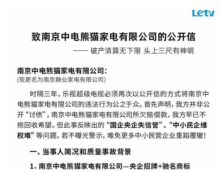 乐视超级电视在公开信中声明,我方并非公开“讨债”,南京中电熊猫家电有限公司所欠赔偿款,我方早已不抱回收希望。但此事反映出的“国企央企失信誉”、“中小民企维权难”等问题,若不曝光警示,难免更多中小民营企业重蹈覆辙!