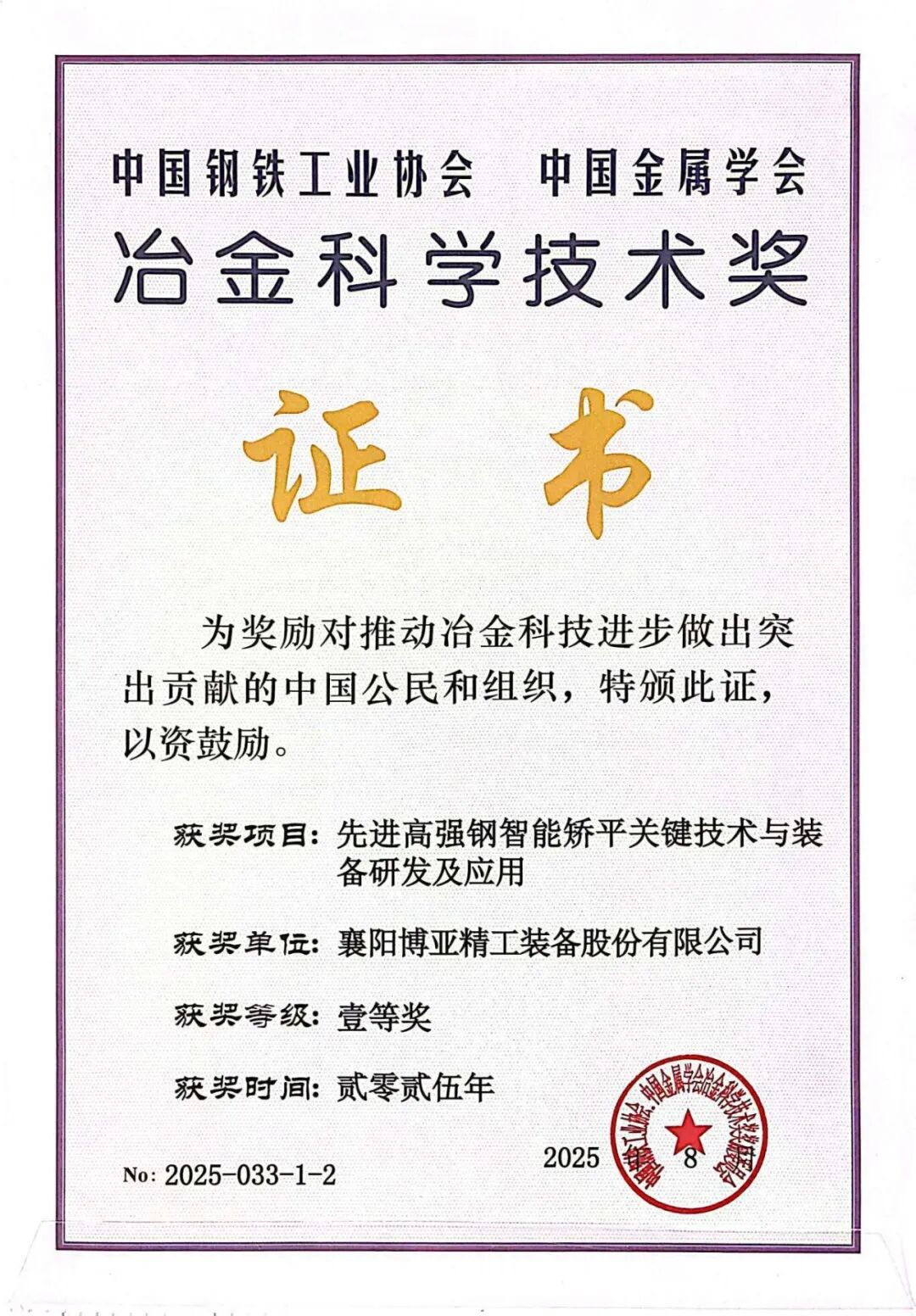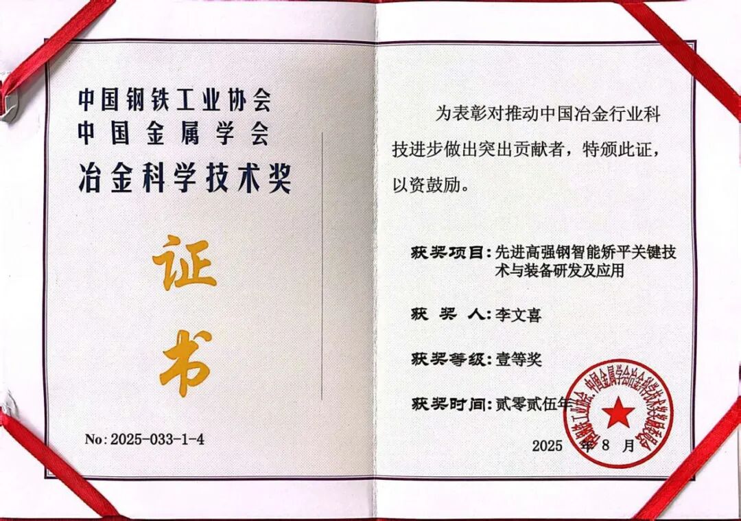 近日,中国钢铁工业协会、中国金属学会联合公布了2025年度冶金科学技术奖获奖名单。由襄阳博亚精工装备股份有限公司与武汉科技大学共同完成的“先进高强钢智能矫平关键技术与装备研发及应用”项目脱颖而出,荣获一等奖。这一奖项的获得不仅是对双方产学研合作成果的高度肯定,更是博亚在高端冶金装备技术领域的重大突破。