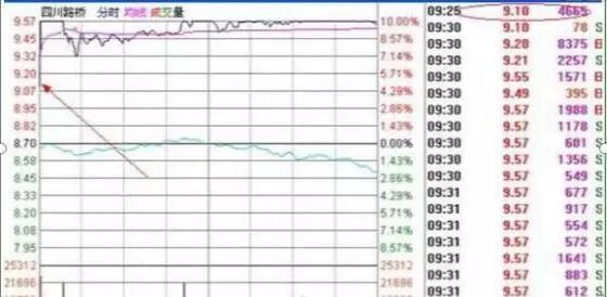 600039,四川路桥(600039),流通盘3.04亿,2010年5月31日,集合竞价时4665手巨量超强高开4.3%,远高于该档的2000手标准,资金注入强度值极高,我们看看该股的技术形态: