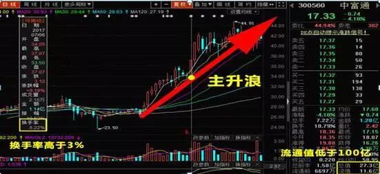 以中富通为例,流通盘仅为11.6亿。7月6日,该股股价大涨9.19%,突破全部均线压制,当日换手率为8.22%,主力资金疯狂抢筹,主升浪正式宣告开始,此时正是极佳的买入时机!