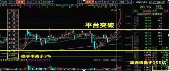 以长江通信为例,流通盘仅为41亿。7月16日,该股股价大涨8.75%,且一举突破此前的箱体走势。从换手率看,当日长江通信换手率高达7.99%,符合我们集合竞价买入法的全部指标。