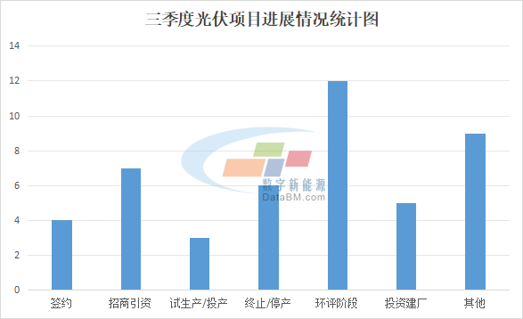 其中签约项目有4个,处环评阶段的有12个,投资建厂有5个,试生产/投产项目有3个,其他进展(备案、节能获批等)9个。此外,处于招商引资阶段项目有7个,宣布终止建设/停产的项目有6个。