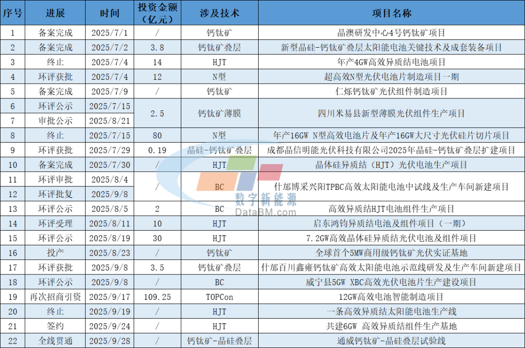 另外从技术角度看,2025年第三季度,各大光伏企业将重心转向新技术押注,钙钛矿技术成为“香饽饽”。而此前热捧的TOPCon技术,新增产能显著放缓,仅新疆克拉玛依市政府推进的12GW 高效电池智能制造项目。