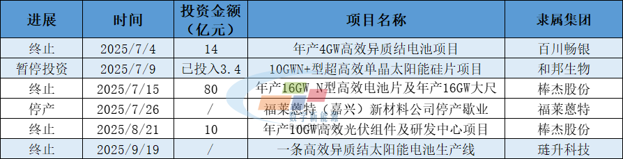 此外自7月行业减产以来,光伏企业主动暂停或终止了部分项目以求减亏。