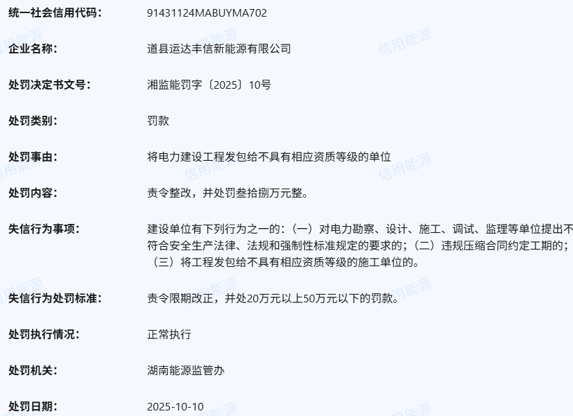 道县运达丰信新能源有限公司因将电力建设工程发包给不具有相应资质等级的单位被湖南能源监管办处罚,责令限期改正,并处20万元以上50万元以下的罚款,处罚决定书文号为湘监能罚字〔2025〕10号。