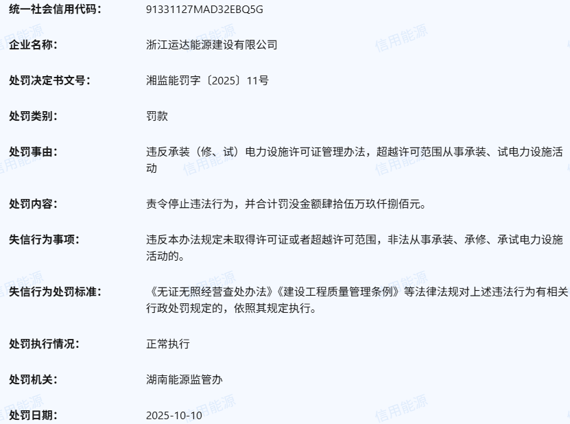 浙江运达能源建设有限公司因违反承装(修、试)电力设施许可证管理办法,超越许可范围从事承装、试电力设施活动,被湖南能源监管办处罚,责令停止违法行为,并合计罚没金额45.98万,处罚决定文书号湘监能罚字〔2025〕11号。