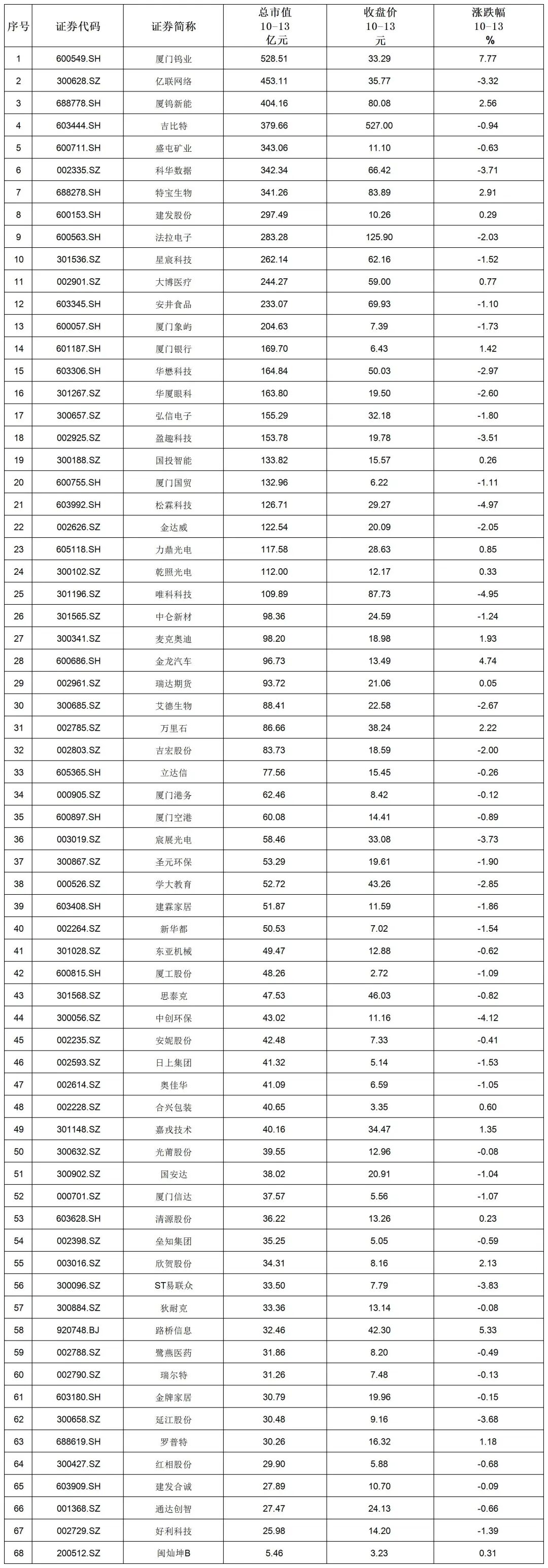 10月13日,上证综指下跌7.53点,跌幅0.19%,收盘于3889.50。辖区内上市公司总计68家,总市值8078.22亿元。