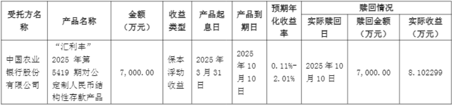 公司于2025年3月28日购买了中国农业银行股份有限公司发行的“汇利丰”2025年第5419期对公定制人民币结构性存款产品,截至本公告日,公司已赎回上述产品,获得本金及收益合计人民币70,081,022.99元,具体情况如下: