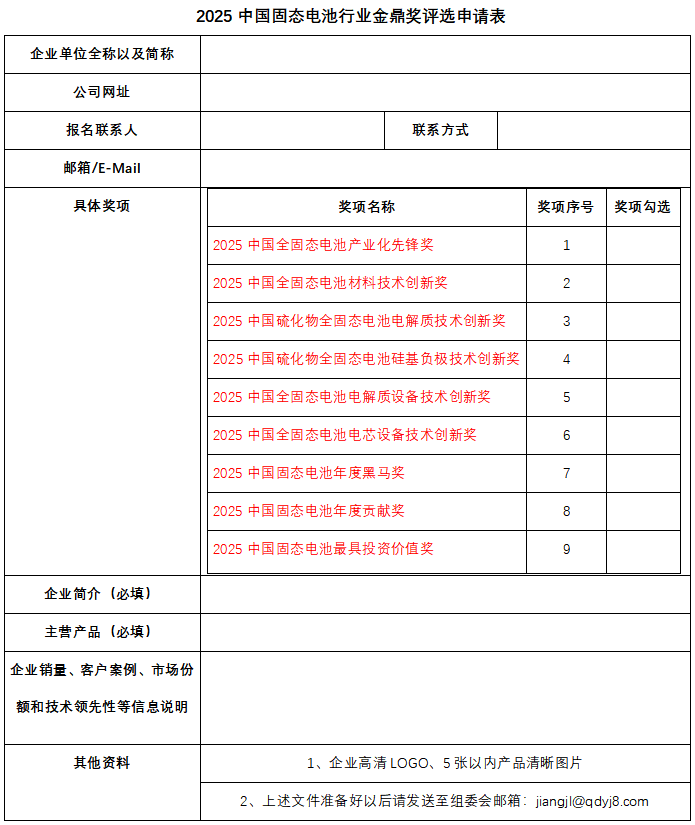 参选企业要求:在固态电池产业链相关上下游的领先和创新企业,参加评选企业需提交报名表格给主办方。