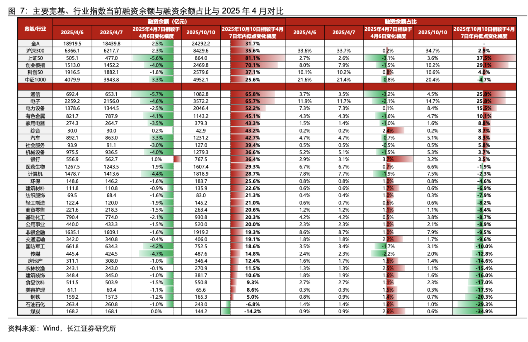 从杠杆资金上看,相较于 4 月 7 日年内低点,主要宽基指数与大多数行业指数融资余额上升。宽基层面,相较于 2025 年 4 月 7 日,主要宽基指数中,上证 50、创业板指、科创 50 等指数融资余额上升较多;行业层面,通信、电子等指数融资余额上升幅度较大。在 4 月 7 日当天,在市场调整时期,通信、传媒、电子等行业融资余额回落幅度较大,银行融资余额上升约 1%。