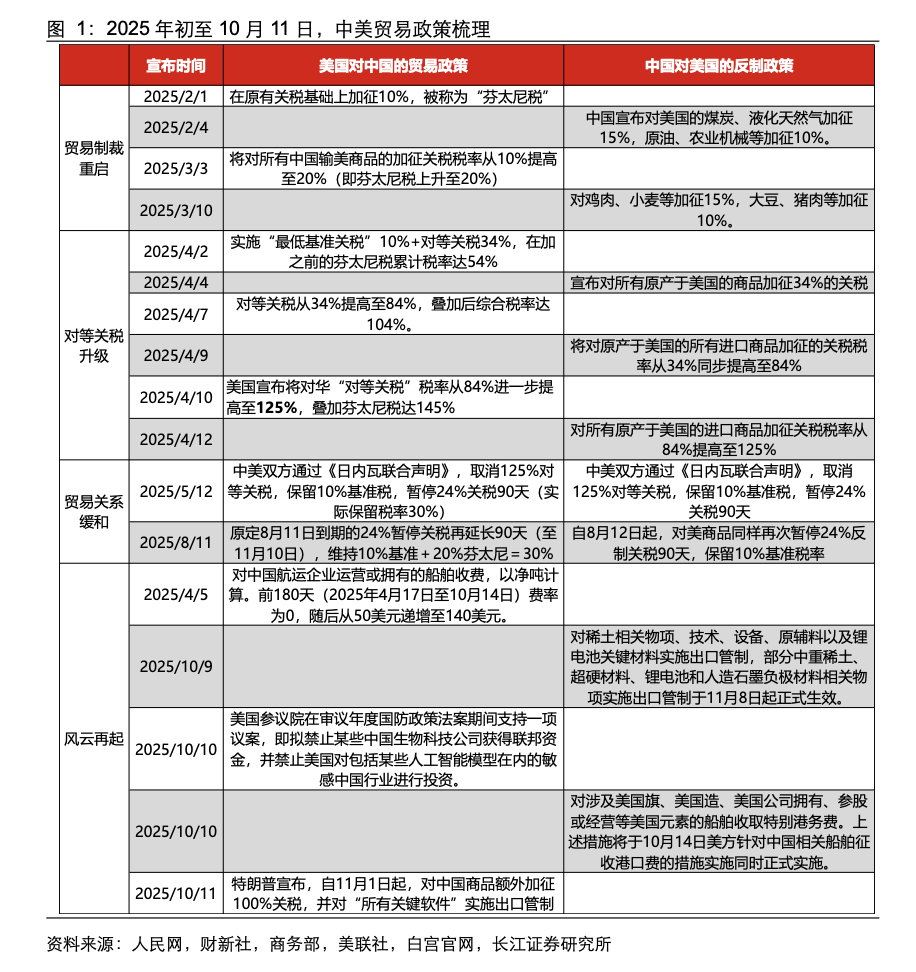 对比4月,10月中美双方在在贸易策略和维度上呈现出显著差异,“TACO”交易重现概率更高。1)在反制策略上,中方在10月的回应显得更加精准和"镜像对称"。与4月主要以对自美国进口的所有提高关税税率作为回应不同,中国在10月采取了一系列针对特定行业的措施:针对美国对中国航运企业的不合理收费,中方对美国船舶征收特别港务费;针对美国限制中国生物科技行业,中国则通过管制稀土出口这一美国高端制造业依赖的关键资源进行回应,显示出更加精细化的反制思路;2)相比4月,特朗普10月留有更明显的谈判空间。特朗普在宣布加征100%关税时未否定在10月31日韩国APEC峰会期间与中国进行对话的可能性,出现“TACO”交易概率相对更高;3)市场对10月关税威胁的反应预计比4月更有韧性。经历前期摩擦后,市场对中美博弈模式已形成一定预期。加之中国率先出台针对性反制,展示出在特定领域的反制能力与筹码,使市场倾向于认为本轮博弈更多是为谈判积累筹码,而非立即全面实施,因此反应可能更为理性。