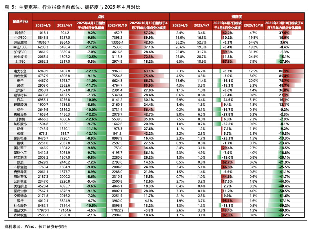 从拥挤度上看,相较于 4 月 7 日年内低点,科创 50 指数拥挤度显著上升。 宽基层面,科创 50、中证 500、深证成指等指数拥挤度上升较多;行业层面,电力设备、有色金属、电子等指数拥挤度上升较多。在 4 月 7 日当天,在市场调整时期,银行、农林牧渔、煤炭等防御型板块表现靠前,拥挤度大幅上升。