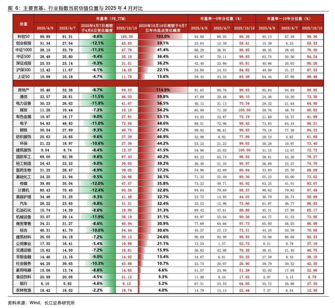 从估值上看,相较于 4 月 7 日年内低点,双创指数估值显著上涨。宽基层面,相较于 2025 年4 月 7 日,主要宽基指数中,双创指数估值显著上涨,科创 50 估值上升超 100%;行业层面,房地产、通信、电力设备等指数估值上升幅度较大。在 4 月 7 日当天,在市场调整时期,农林牧渔、银行、食品饮料等行业估值回落幅度较小。