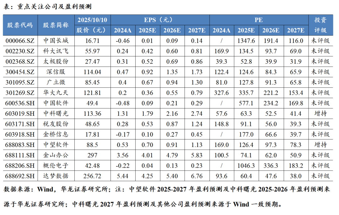 投资建议:我们认为软件国产化正有序推进,政企端需求有望进一步释放。国际贸易摩擦仍有反复风险,自主可控仍将是长期趋势。国内领军企业始终坚持长期主义,产品正从“可用”迈向“好用”,带来业绩边际改善预期。综上,维持计算机行业“推荐”评级,建议关注:(1)政务:金山办公(688111.SH)、科大讯飞(002230.SZ)、深信服(300454.SZ)、太极股份(002368.SZ)、税友股份(603171.SH)、金桥信息(603918.SH);(2)基础软硬件:中国长城(000066.SZ)、中国软件(600536.SH)、中科曙光(603019.SH)、达梦数据(688692.SH);(3)工业软件:广立微(301095.SZ)、中望软件(688083.SH)、概伦电子(688206.SH)、华大九天(301269.SZ)。