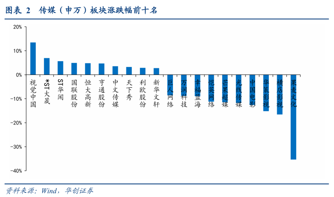 从个股看,视觉中国(13.44%)/*ST大晟(6.94%)/ST华闻(维权)(5.63%)/国联股份(维权)(4.91%)/恒大高新(4.79%)领涨。果麦文化(-35.35%)/横店影视(-16.56%)/华策影视(-15.18%)/中国电影(-12.6%)/光线传媒(-11.72%)领跌。