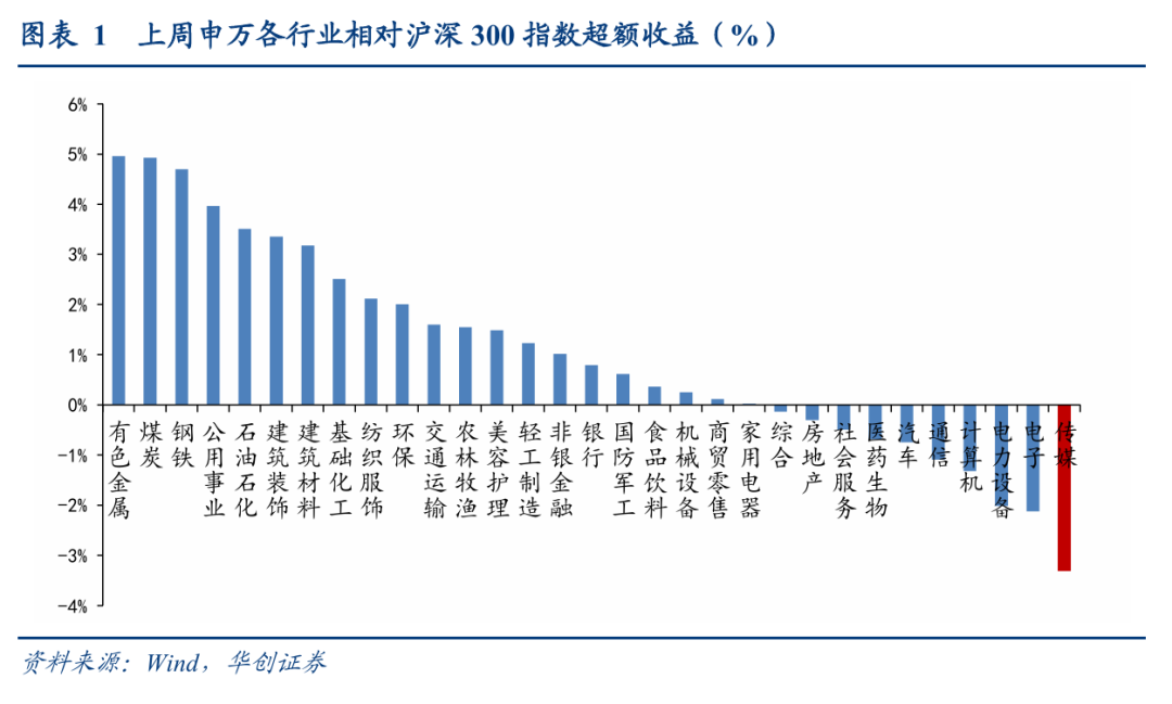 上周传媒(申万)指数整体下跌3.83%,同期沪深300指数整体下跌0.51%,板块跑输沪深300指数3.31%,位列所有板块第31位。
