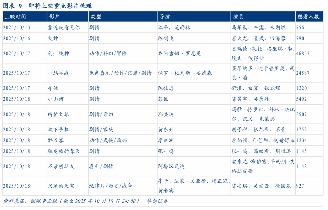 根据猫眼专业版,2025.10.13-2025.10.19待上映的影片包括《靠近我看见你》《火种》《创:战神》等。