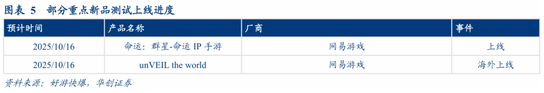 新游方面,下周10月16日《命运:群星-命运IP手游》已定档将正式上线,同日《unVEIL the world》将海外上线。