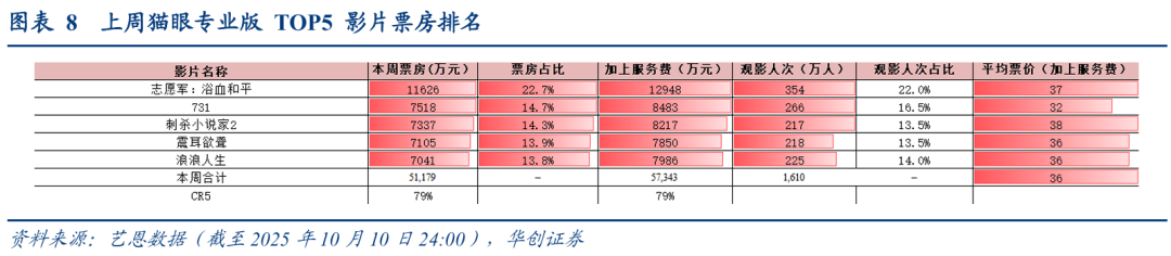 根据艺恩数据票房排名,2025.10.6-2025.10.10(周一到周五)院线上映电影TOP5分别为《志愿军:浴血和平》、《731》、《刺杀小说家2》、《震耳欲聋》、《浪浪人生》,五部影片票房(不含服务费)分别11626万/7518万/7337万/7105万/7041万,当周票房比例分别22.7%/14.7%/14.3%/13.9%/13.8%。