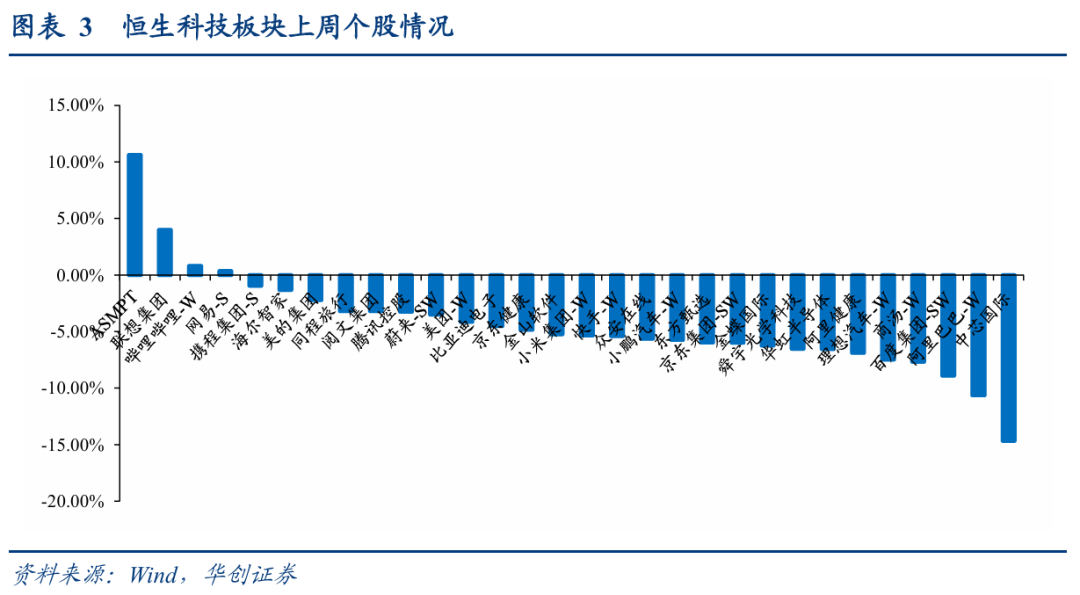 本周港股互联网科技板块涨跌幅:ASMPT(10.61%)/联想集团(3.99%)/哔哩哔哩-W(0.8%)/网易-S(0.34%)/携程集团-S(-0.96%)领涨。中芯国际(-14.69%)/阿里巴巴-W(-10.64%)/百度集团-SW(-8.9%)/商汤-W(-7.67%)/理想汽车-W(-7.48%)领跌。