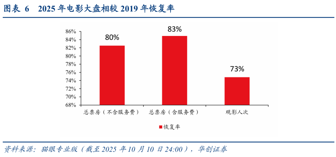 根据猫眼专业版,截至10月10日,2025年电影大盘实现票房(不含服务费)394.88亿元,观影总人次10.36亿人;2019年同期电影票房为492.01亿,观影总人次为14.16亿人。复苏节奏看,票房大盘已恢复约80%,观影人次已恢复约73%。