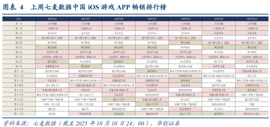 根据七麦数据,2025年10月4日至2025年10月10日游戏iOS畅销排行显示,腾讯系产品表现突出,《王者荣耀》一直占据畅销榜第一名,《三角洲行动》和《地下城与勇士:起源》稳定在前五名内,《和平精英》也常居于前列。网易系产品《梦幻西游》处于中上游位置,基本保持在第五、六名。