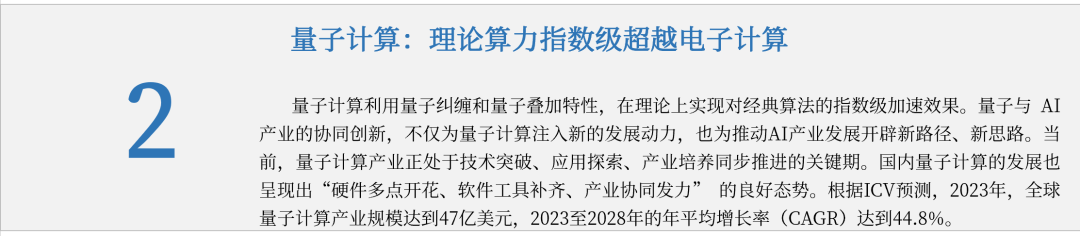 量子计算理论算力指数级超越电子计算。量子计算利用量子纠缠和量子叠加特性,在理论上实现对经典算法的指数级加速效果。量子与AI 产业的协同创新,不仅为量子计算注入新的发展动力,也可能为推动AI产业发展开辟新路径、新思路。当前,量子计算产业正处于技术突破、应用探索、产业培养同步推进的关键期。国内量子计算的发展也呈现出“硬件多点开花、软件工具补齐、产业协同发力” 的良好态势。根据ICV预测,2023年,全球量子计算产业规模达到47亿美元,2023至2028年的年平均增长率(CAGR)达到44.8%。