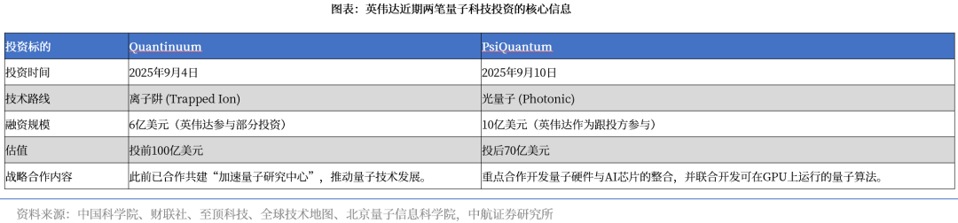 科技巨头英伟达对量子计算的态度发生较大转折。英伟达CEO黄仁勋在年初还认为量子计算实用化还需“数十年”,6月份即公开表示该技术正迎来“拐点”,实用化可能比预期更早到来。英伟达的战略并非自己制造量子处理器(QPU),而是致力于成为连接量子计算与经典高性能计算的平台和基础设施提供者。其早在2024年11月推出的CUDA-Q开源平台就是这一战略的核心,旨在将GPU的优势与量子处理器相结合。近期,英伟达已经完成对两家量子计算企业投资,分别为离子阱(Trapped Ion)技术路线的Quantinuum,以及光量子技术子(Photonic)路线的Postquantum。