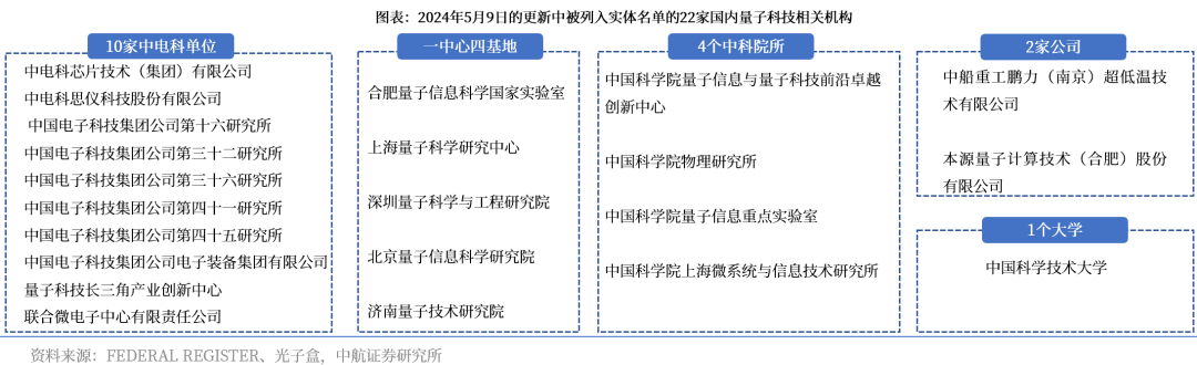 中美科技竞争加剧,22家国内量子科技研发机构被列入美国实体清单。当地时间2024年5月9日,美国商务部发布消息,37家中国实体被加入实体清单,其中22个实体与量子科技有关。北京量子信息科学研究院、中国科学院量子信息和量子科技前沿创新卓越中心、本源量子、深圳量子科学与工程研究院等国内一线量子产业科研机构均在名单上。