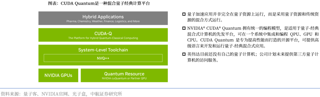 资料来源:中国信通院,中航证券研究所全球来看,量子计算软件开源平台的建设日趋完善。近年欧美科技巨头和初创公司都在开发和提供各种量子计算软件开源平台, 以便开发者和用户访问和使用量子计算资源,进行量子算法的设计、测试和优化。像IBM的Qiskit、英特尔的QAT、亚马逊的Braket等,是目前较知名和流行的量子计算软件开源平台,各自支持不同的量子计算硬件和云服务,提供不同的量子编程语言和工具。未来的量子计算软件开发方向,除了基于当时及可预见的未来量子计算硬件的水平,还将聚焦于提高计算正确性、优化编译器和运行时系统的效率、模块化程序设计,以及完善调试工具等方面。并且,还需要考虑到经典﹣量子协同的支持能力。这些方向将有助于建立更加灵活和可扩展的量子计算软件体系,在硬件和软件之间建立更紧密的协同关系,增强量子计算的实用性。