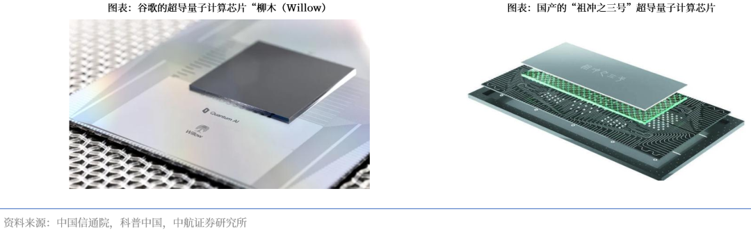 国内进展2:2024 年 12 月 17 日,中国科学技术大学研究团队成功研制出全新的“祖冲之三号”超导量子计算芯片。研究结果表明,“祖冲之三号”超导量子计算芯片在各种性能指标上与Willow 超导量子计算芯片旗鼓相当。