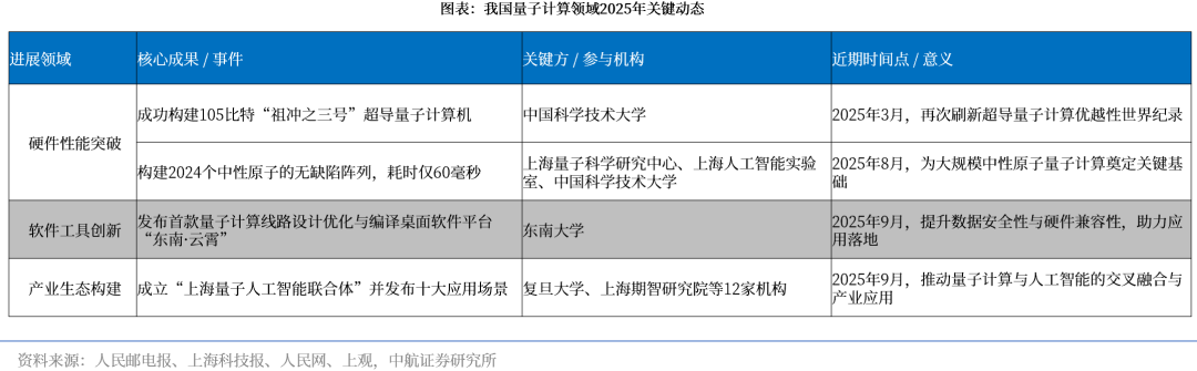 资料来源:中国信通院,中航证券研究所中国信通院发布的《量子计算发展态势研究报告(2025 年)》显示,行业多种硬件技术路线并行发展、各具优势,也须面临不同的应用难题挑战。