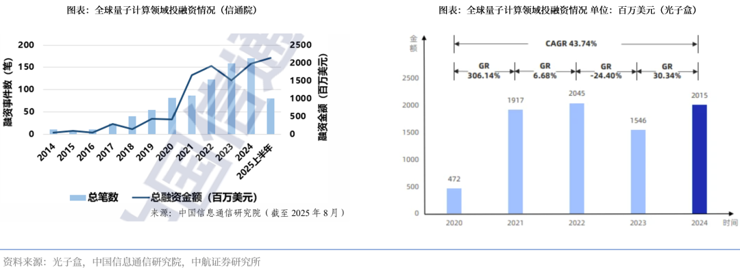 2017年行业投融资活跃度开始明显提升,2021-2022年总量初具规模。2021年起每年公开披露的投融资总金额突破15亿美元,2022年度投融资笔数超过100笔。2024年全球量子计算领域的融资总额为20.15亿美元;相比于2023年,增长了30.34%,行业成长动能进一步增强。2025年上半年仅量子计算领域投融资金额已经超过20亿美元,PsiQuantum(7.5亿美元)、QuEra(2.3亿美元)、Multiverse Computing(两轮共 2.85 亿美元)等业内知名企业获得大笔融资,预计全年投融资总金额将达到新的高峰。整体来看,相关领域投融资活动渐趋活跃,但仍处于相对早期投资阶段。此外,政府支持的创新投资计划等机制正在全球范围内发挥积极作用。