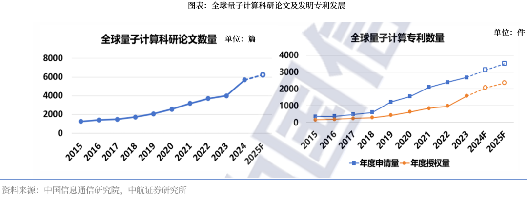 理论研究:全球量子计算科研论文数量,从2015年的1000余篇增至2024年的5000余篇。2019年开始进入加速期,2020-2021年均增量超过500篇,2024年增量达到1600余篇、同比增速42%。基于发展趋势判断,我们认为在相关基础理论科研领域已经进入不断突破、快速落地的成长早期。
