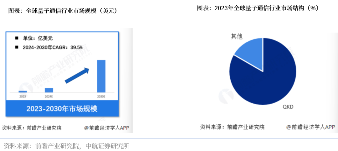 行业规模。量子通信是量子信息学的重要分支,其具有不可克隆、不可分割和不可预测的特性,能够从根本上保证信息传输的绝对安全。根据前瞻产业研究院相关数据,2023年全球量子通信行业市场规模仅约10亿美元。初步估算,随着国防、信息安全需求的不断增长,2024年全球量子通信行业市场规模将快速增长超过26亿美元,未来六年行业复合增速更将达到39.5%。