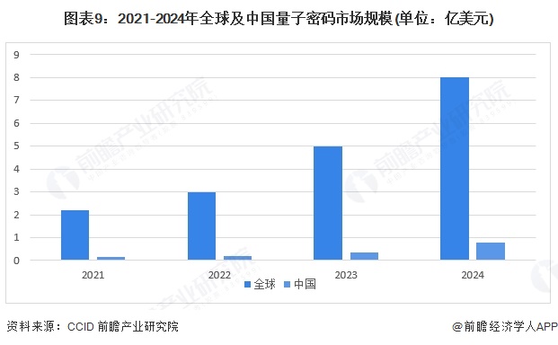 量子密码是量子通信的核心技术之一,主要通过量子密钥分发(QKD)实现信息传输的绝对安全性。通过密钥分配技术(如量子密钥分发,QKD),能提升安全性,可以应用在金融、政务等高安全领域,是未来量子互联网的重要技术,是未来信息安全的核心。2023年,全球量子密码市场规模达到4.2亿美元,中国量子密码市场规模达到0.35亿美元,占全球量子密码市场规模8.3%。初步测算,2024年中国量子密码市场规模为0.8亿美元,年复合增速超过70%。