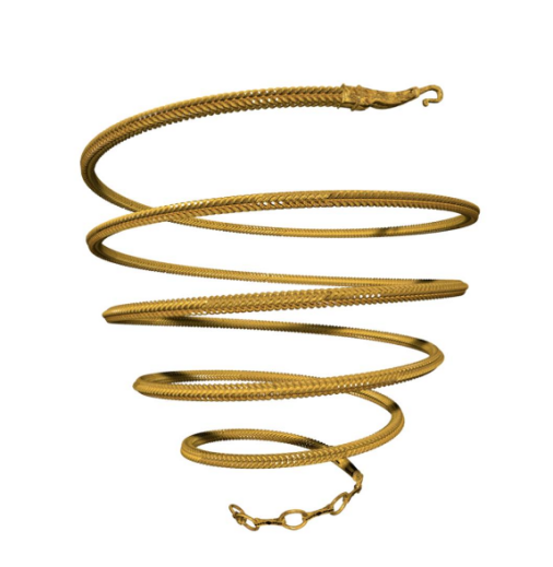 著名的“大金项链”,是1987年“南海I号”被发现时出水的第一件金器。它长达1.72米,由四股八条纯金线编制而成,一端是长条形带钩,饰有花纹,另一端有四个小圆环,便于调节长度,整体呈现出阿拉伯艺术风格。结合它的磨损程度推断,应是船上外国乘员长期佩戴的饰物,不排除其主人本身就是从事黄金奢侈品贸易的商人,如此长的金项链,不仅是非凡财力的象征,可能也有“广告作用”。