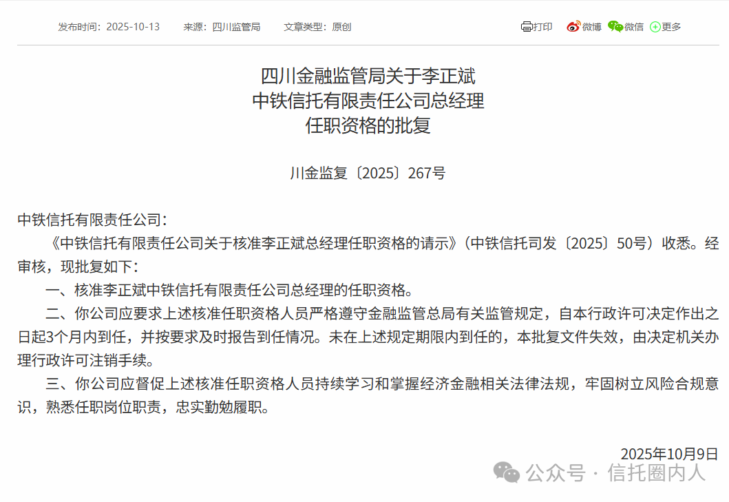 10月13日,四川金融监管局公布相关批复,核准李正斌中铁信托有限责任公司总经理的任职资格。以下是相关批复正文: