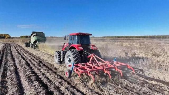在同江市临江镇富川村的高标准大豆示范田收获现场,大型收获机往来穿梭,金灿灿、圆滚滚的大豆从出粮口倾泻而下,落入运粮车中,紧随其后的大型整地机车“无缝衔接”,勾勒出一幅“秋耕沃野、颗粒归仓”的壮美秋收图。