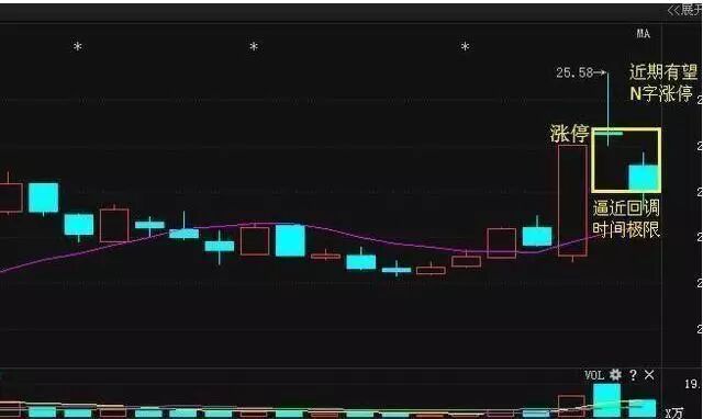 看上图鸿特精密也是N字涨停形态,该股在连续回调3天后,到了战法所说的回调时间极限,符合我们所讲的选股方式。