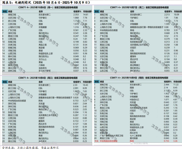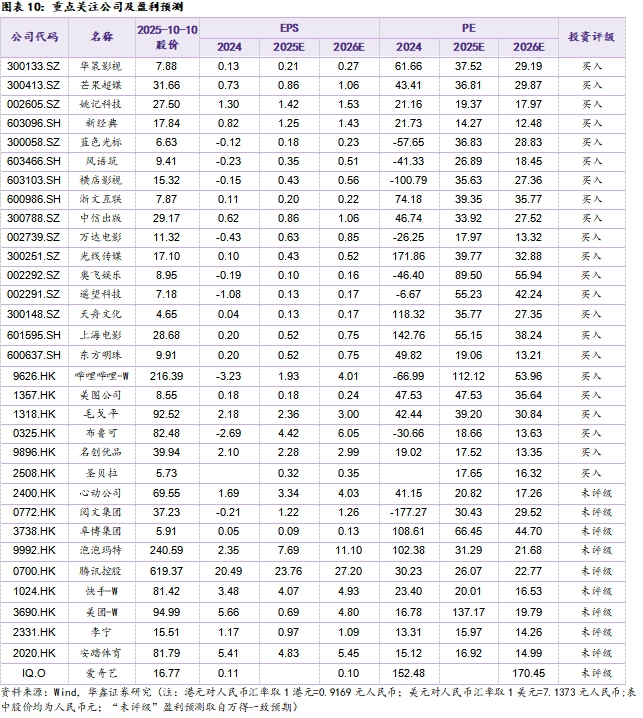 给予传媒行业推荐评级。A股可关注,东方明珠600637(2025年10月旗下百视通云游戏正式登陆长虹电视大屏,后续还将延伸至特斯拉、理想等车载智能屏,实现家庭、出行等多生活场景渗透);芒果超媒300413(大芒剧场《少年田野》定档10月13日);蓝色光标300058(将受益于Sora2助力内容营销,延安小青马数字藏品正式发行);万达电影002739(国庆档板块性承压,关注万达后续影片供给以及非票收入通过创新拉动创收);汤姆猫300459(关注后续AI新品供给,同时数字营销业务也有望受益Sora2以及字节跳动产业链);奥飞娱乐002292(拥有“超级飞侠”“喜羊羊”等IP矩阵,已推出集换式卡牌产品);中信出版300788(夸父AI数智出版平台持续提质增效);华策影视300133(国庆档虽略承压但作为剧集龙头有望持续受益Sora2);姚记科技002605(关注卡牌板块热度拉动情绪);天舟文化300148(教辅与游戏双主业业绩增长);荣信文化301231(加速AI场景落地,多款AI助读智能体正式上线);上海电影601595(受益IP+文旅赋能消费新场景);横店影视603103(国庆档承压,看后续借力横店的影视产业资源加强文旅业务融合);浙文互联600986(全链路AI布局再迎发展新机遇);港股可关注,B站9626(已开启双十一招商预热);腾讯0700(2025年8月新游《无畏契约:源能行动》表现优异);阿里9988(已组建一支“小型机器人与具身AI团队”);阜博集团3738(以数字内容收益开拓RWA新路径作);美图1357(2025年9月与阿里巴巴通义实验室达成合作);布鲁可0325(2025年10月将发布三丽欧家族系列、宝可梦经典版、超级站队群星版第二弹);圣贝拉2508(小红书的另一种表达,2025年上半年业绩增长向好,关注后续出海与AI的进展);毛戈平1318(国庆期间美妆品类表现尚可,等待后续开店进展);名创优品9896(9月26日TOPTOY向香港联交所提交上市申请,拆分上市)。