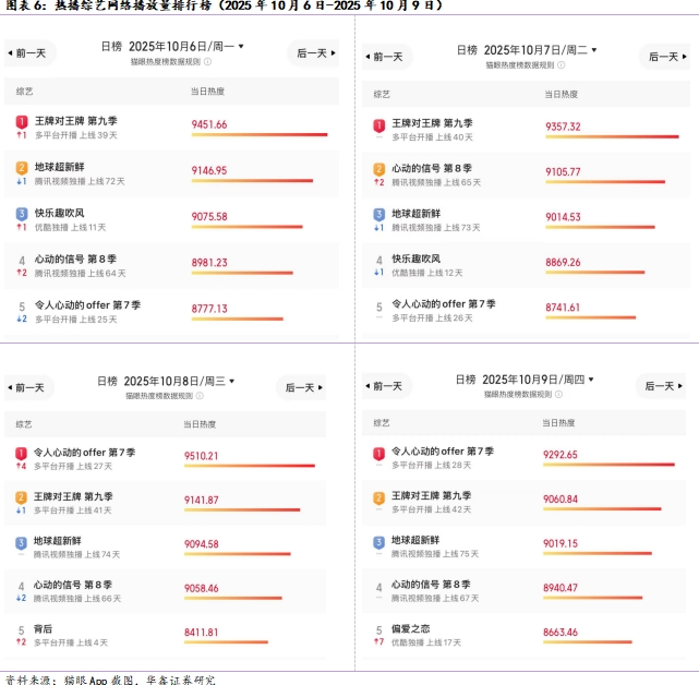 综艺节目方面,如下图所示,周度全网热度榜靠前的综艺有《地球超新鲜》、《心动的信号 第八季》、《王牌对王牌 第九季》。