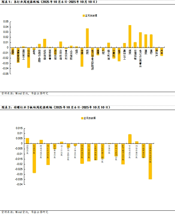 市场综述:2025 年10月6日-2025 年10月10日,上证综指、深证成指、创业板指的涨跌幅分别为0.37%、-1.26%、-3.86%。细分到传媒各子行业来看,智能电视指数涨幅较大,万得虚拟现实指数跌幅较大。周涨跌幅个股中,涨幅 Top3 分别为视觉中国、欢喜传媒、遥望科技,分别上涨13.44%、10.29%、8.46%;跌幅 Top3 分别为果麦文化、横店影视、华策影视,分别下跌35.35%、16.56%、15.18%。